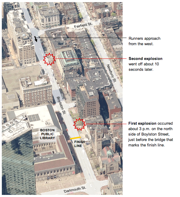 Relatives of the victims of December’s school massacre in Newtown, Conn. were among those attending the race finish at a VIP area. It was not known of any of the relatives were among the casualties.